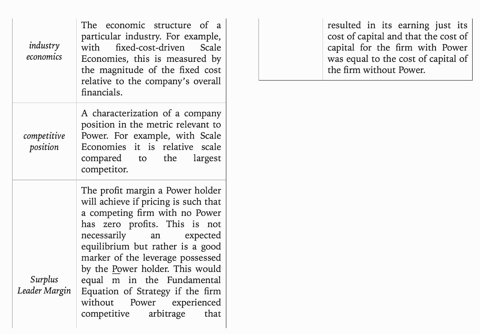 Process Power: when institutional knowledge creates a more production company. Examples are Toyota and Danaher.