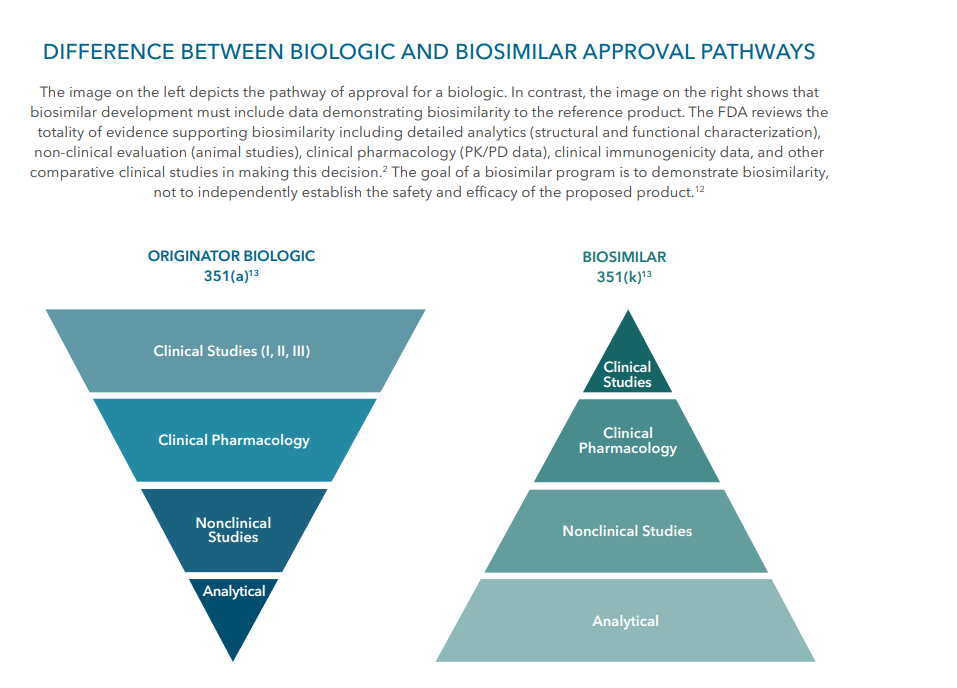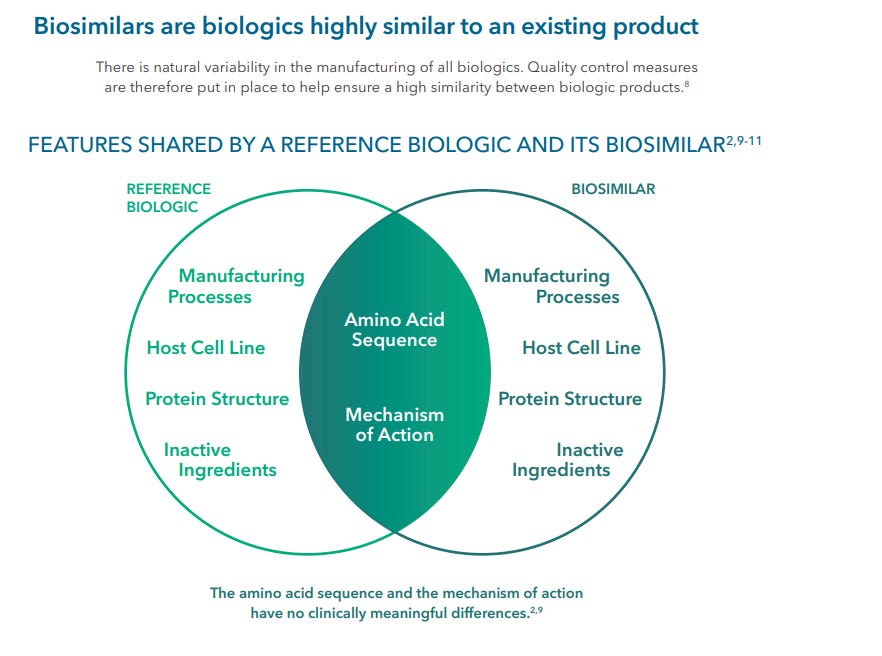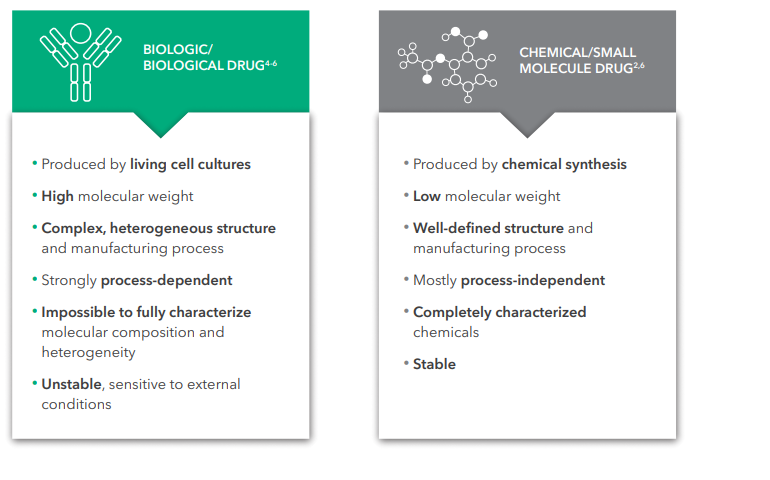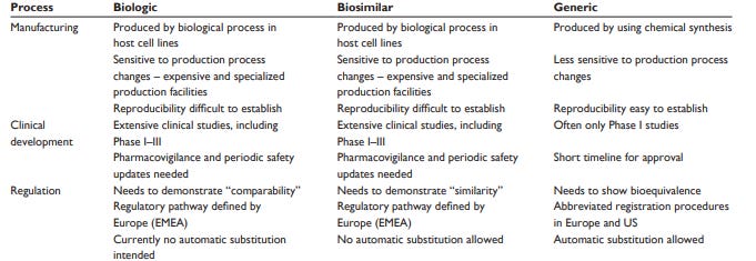 The process to produce a generic biologic is far more complex than creating a generic small molecule drug. Biologics are manufactured by cells, which are a lot more variable than chemical synthesis. Unlike generic small molecules, it is impossible to generate a biosimilar that is identical to a biologic (incumbents don’t share their manufacturing protocols). Biosimilars may not be identical like generic pharmaceuticals, but are similar to the branded biologics based on effects.